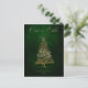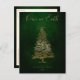 Elegant, striking and timeless holiday design featuring pine tree in gold gradient embossed style with "Peace on Earth" custom gold calligraphy script on glowing deep green artisan background with two lines of editable text. Back features complementary graphics and additional text fields. All graphic elements are editable.