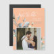 This save the date magnetic card features elegant watercolor greenery foliage leaves arrangements and beautiful calligraphy and simple serif typography font with a square photo frame on a peach background for a clean minimalist and modern look, which is a beautiful way to inform about your upcoming wedding or elopement. Just personalize the text and add a personal touch with a beautiful photo of the couple.
