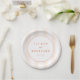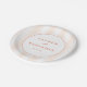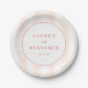 This elegant wedding plate features a minimalist design with soft peach and cream vertical stripes as the background. The central circular frame, outlined in coral, highlights clean serif typography for the names and a simple sans-serif font for the date, creating a harmonious balance. The understated color palette and refined layout convey a sophisticated mood, perfect for formal celebrations. Customizable text allows personalization, making it an ideal choice for memorable occasions like weddings.
