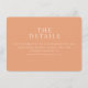 This wedding enclosure card features a minimalist design with a warm peach background, creating an inviting and elegant atmosphere. The layout is clean and simple, utilizing a serif font for both the prominent heading "THE DETAILS" and the accompanying text, which guides guests to visit a website for more information. The use of negative space enhances readability, ensuring that the focus remains on the essential message. Perfect for formal weddings, this card combines sophistication with approachability, making it ideal for conveying important details in style.