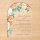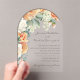 Beautiful and elegant peach and cream watercolor floral and greenery botanical watercolor arch-shaped acrylic wedding invitation with a clear, see-through background.