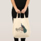 This Elegant Peacock Bride Squad Tote Bag features a hand-drawn blue and teal peacock perched on Magnolia branches in full bloom in black ink and the title "Bride Squad". Personalize with your city and date by clicking on "Personalize this template" on the product page.