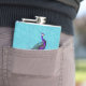 Elegant lady's flask done in a turquoise swirly pattern background, with graphics of a colorful purple and teal peacock sitting on a lavender flourish. Personalize the purple script text to suit your needs. Makes a lovely gift idea.