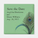 Colorful peacock feathers accent this Save the Date magnet on a bright green background.