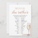 The Elegant Gold Pearls and Prosecco Would She Rather Game is a delightful addition to your bridal shower celebration. Featuring elegant gold pearls and prosecco motifs, this game offers a fun and engaging way for guests to share their preferences and insights. With thought-provoking questions, it's sure to spark laughter and lively conversation among attendees, making it a memorable part of the festivities.