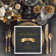 Add a sophisticated touch to your holiday celebrations with these personalized Christmas napkins. Featuring a luxurious gold script greeting, elegant ribbon banner, clinking champagne glasses, and your custom family name and year.