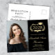 Modern black and gold college graduation party invitation postcard featuring "Class of" and the class year within a laurel wreath, a grad cap, a diploma, a photo of the graduate and their name in an elegant script. Add their school, major, honors or future plans. On the reverse side, add the grad party details.