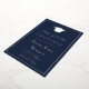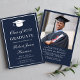 Elegant formal blue college graduation announcement and party invitation featuring real silver foil, a grad cap, the graduate's name and class year in a classic calligraphy script, and their school, major and honors. On the back, add a photo and personalize your party details in clean white lettering.