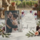 Express your gratitude with a sophisticated botanical design featuring deep crimson blooms gracefully framing your favorite custom newlywed picture.This design features a highly legible typographic hierarchy, pairing classic serif body text with an elegant handwritten calligraphy script for the appreciation message. The visual composition centers a custom couple's portrait photograph, formally framed by soft corner clusters of deep maroon blooms, dusty blue botanicals, and cream floral accents against a crisp, high-contrast background. The blend between the rich color palette and subtle pastel tones establishes a timeless garden aesthetic, while a small heart icon anchors the layout.This is a flat printed image with a soft watercolor painted effect, not actual raised material or textured canvas.