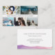 Flat business card for a professional photographer, where you can showcase your work in a photo collage with room for five of your photos. Add your name and specialty or title or service on the cover. Add your contact information on the back, which is decorated with a stroke of watercolor in pink and purple. An elegant, minimalist business card, perfect for a wedding photographer.