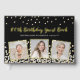 Elegant custom birthday guest book design featuring gold and silver confetti over a black background, modern script typography with the words "100th Birthday Guest Book" (in gold foil), your name and date (in silver), and three of your favorite photos framed in gold foil.