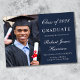Simple and modern dark navy blue college graduation announcement featuring a photo of the graduate, his or her name and class year in an elegant white script and his or her university, major and honors.