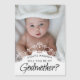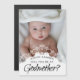 "Will you be my Godmother?" elegant godfather proposal magnetic card. Perfect alternative to card that can be easily displayed on the fridge etc for anyone to see. Design features of stylish white ornamental frame on top of your favorite photo of the baby.