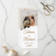 This elegant wedding program feature a space for a photograph of you and your soon-to-be spouse, and text in a classic and sophisticated gold script.