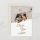 Express your gratitude in style with our Elegant Gold Script Wedding Thank You Card. This beautifully designed card features a sophisticated gold script, providing a space for a cherished photo of the happy couple. On the back, a heartfelt message of thanks is printed, conveying your appreciation with elegance and sincerity. Perfect for sharing your special moments and heartfelt gratitude with loved ones, this card is a memorable way to say thank you for being a part of your wedding celebration.