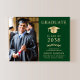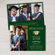 Elegant green college graduation announcement featuring the graduate's photo, a gold grad cap, the grad's name in classic gold serif typography, and their school, major, honors or future plans. On the back, add 3 additional photos and your personalized announcement message.