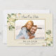Elegant Save The Date photo frame design features your engagement picture framed by a chic sparkling golden color frame. Romantic, chic botanical white vanilla wedding roses displayed in leafy greenery add a trendy and sophisticated touch on an eggshell color background. Personalize with your favorite picture. (For best placement of your picture, use a photo editing tool to center and crop BEFORE uploading to the Zazzle website.) . Share your engagement and wedding details with your guests in elegant charcoal gray lettering and script. The back of the card is a simple matching eggshell color. Feel free to contact me at invitationsuites@gmail.com if you have questions regarding this or any of our designs.