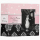Stylish wedding scrapbook album binder, done in black, pink, and white. A whimsical white on pink polka dot pattern on the top half of the binder and a white on black damask pattern, on the bottom. A large pink satin looking stripe across the middle for your text and graphics of black picture corners, to hold your photograph. Personalize the black script text to what ever you want.