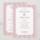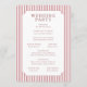 This wedding program features an elegant rectangular layout with vertical orientation, framed by pink and white diagonal stripes on the sides. The central area showcases a soft cream background bordered by a decorative frame with ornate corners, creating a classic and sophisticated look. The design uses a harmonious color palette of muted pinks, creams, and deep maroons, evoking warmth and tradition. Typography is clear and structured, with customizable sections for names, ceremony details, date, and location, making it perfect for personalization. Ideal for weddings, this program combines formality with a touch of charm, setting the tone for a memorable celebration.