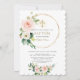 Romantic design featuring watercolour white, cream, blush pink flowers, faux gold round frame, floral divider, all on a white background; on the back The same flowers bouquet. Use Personalize this template to add your info. For matching items, please, visit my New Baptism Collection.
