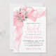 This cute pink bow bridal shower invitation features a soft pink watercolor bow with flowing ribbons along the top and left edges for a sweet, playful look. At the center of the bow sits a delicate cluster of pink roses and soft floral accents, adding a romantic and elegant touch that complements the design beautifully. The top of the invitation reads “bridal shower” in a charming mix of script and serif fonts, setting a modern yet cute and graceful tone. The remaining details keep the layout light, feminine, and fun.