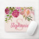 Mousepad with beautiful blush pink and bright pink watercolor flowers and greenery. Personalized by your monogram/initial and name.