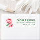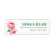 This return address label features a clean, minimalist design with two large pink peonies on the left and elegant serif typography on the right. The soft pink petals contrast beautifully with deep green leaves, creating a classic and refined look. The layout is spacious, allowing each element to stand out distinctly, perfect for formal occasions. The overall aesthetic conveys grace and understated beauty, making it ideal for weddings or sophisticated events.