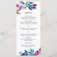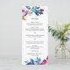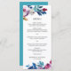 Modern floral Wedding Menu with peonies and roses in bold and vibrant pink with greenery sprigs in shades of teal and blue. The back is a matching shade of teal blue. This bright Wedding Menu in jewel tone colors is great for a summer wedding.