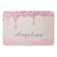 Elevate your bathroom with this elegant pink glam glitter drip bath mat, designed to bring a touch of sparkle and sophistication to your space. Featuring a cascading faux glitter drip in vibrant pink over a soft, glowing background, the design is accented with a subtle dewy glow for a luxe finish. A delicate lace detail along the bottom adds feminine charm. Customize it with a first name for a chic personal touch—perfect for glam home decor, birthday gifts, or dorm room accessories.