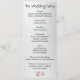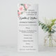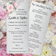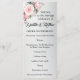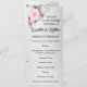 This gorgeous wedding program features a pink and silver theme. There is a beautiful pink floral bouquet in the top corner, with a second smaller rose bouquet on the back at the bottom of the card. All on a metallic silver/grey background.