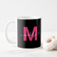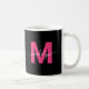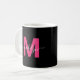 Personalized Modern Elegant Pink And Black Script Name Initial Monogram Coffee Mug. This chic, feminine mug brings a stylish, personal touch to any coffee or tea lover’s collection. Featuring a bold magenta pink initial over a sleek black background with a delicate white script name, the monogram is displayed on both sides, adding a standout, personalized look from every angle. Crafted with a modern minimalist vibe, this mug makes a thoughtful gift for birthdays, housewarmings, holidays, or just because. It’s also a perfect choice for bridal showers, bachelorette parties, or wedding day gifting, blending classic sophistication with trendy, girly charm.