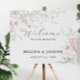 The design features elegant pink wild floral and a simple "Welcome" script.