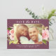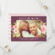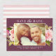 Rich and romantic, this save the date features lush blush peony and dahlia floral corners framing a couple photo on a deep plum background, with classic mixed typography and a soft pink stripe card reverse. The jewel-toned palette makes a striking, sophisticated statement. All text including names, date, and location are fully customizable.