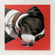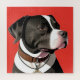 Stylized illustration of a black and white dog in profile view, with vibrant red backdrop emphasizing the dog's elegant silhouette while showcasing its charm.