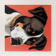 Stylized illustration of a black and white dog in profile view, with vibrant red backdrop emphasizing the dog's elegant silhouette while showcasing its charm.