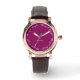 An elegant and festive wristwatch, with the words 'Merry & Bright' repeated around the edge in elegant script typography. The text is white, on a rich blackcurrant magenta face. Personalize this stylish watch with your name or other text for an individual finishing touch.