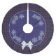 Elegant traditional Pride of Scotland tartan plaid Christmas tree skirt, with graphics of a regency blue (almost purple) circle overlay with big snowflakes, around the edges. Graphics of a white bow, on the front of the skirt, rounds out this chic festive tree skirt.
