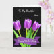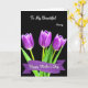 This design shows three purple blooms like spring tulips rising from rich green stems and leaves against a deep black background, creating a romantic, candlelit-style contrast ❤️. Near the top, small white lettering reads “To My Beautiful Nanny,” spaced so it feels airy above the flowers. Lower down, a curved purple ribbon stretches across the card with “Happy Mother’s Day” set in white lettering that stands out clearly. The petals shift from deep plum at the base to softer lavender along the edges, as if they’re catching a gentle spotlight. The upward tilt of the stems and the way the blooms lean slightly toward one another suggests closeness, like a quiet hug shared between loved ones 👩. The greenery fills the lower area with crisp, layered leaves that keep the arrangement grounded and natural. The purple banner sits just beneath the blossoms, with the white words centered neatly across its middle.