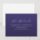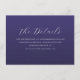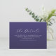 This elegant wedding enclosure card features a deep purple background with crisp white text, creating a sophisticated and modern look. The design showcases a clean layout with prominent script-style typography for the title "The Details," followed by informative text in a classic serif font. Its minimalistic approach emphasizes clarity and refinement, making it perfect for conveying essential information about accommodations and additional details. Ideal for couples seeking a chic and professional aesthetic, this card sets the tone for an organized and stylish wedding experience.