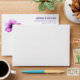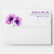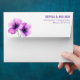 This wedding envelope features a minimalist design with two elegant purple flowers on the left, each showcasing five petals and dark veins radiating from the center. The color palette is dominated by shades of purple and green, creating a serene and sophisticated mood. The text is arranged in a clean vertical column to the right, using a bold serif font for the names and a lighter weight for the address, ensuring clarity and balance. The overall style is modern and refined, perfect for formal occasions, with smooth gradients and clean lines that give it a slightly realistic yet stylized appearance.