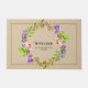This welcome mat features a purple watercolor floral wreath, a classic welcome message, and your family name.