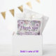 This is a charming customizable Baby Shower favor bag. The background of the bag is adorned with an intricate hand-drawn floral design, creating a vibrant yet delicate backdrop. The blossoming flowers are detailed and varied, painted in various shades of purple, lavender, green, and white. This delightful floral pattern sets a tone of elegance and celebration, perfect for a baby shower.