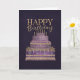 A luxurious birthday card featuring an intricately decorated purple and gold tiered cake set against a rich, dark background. With ornate details, jewel-like accents, and elegant “Happy Birthday” lettering, this design creates a regal and sophisticated look—perfect for celebrating in style.