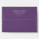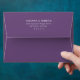 This elegant wedding envelope features a minimalist design with clean, sans-serif typography centered on a rich purple background. The layout is simple yet sophisticated, emphasizing clarity and readability with evenly spaced text for names and addresses. Its modern aesthetic makes it perfect for couples seeking a timeless and uncluttered look to complement their special day. The high-contrast color palette enhances the professional and polished feel of this essential stationery item.