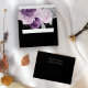 The inside of this elegant modern wedding invitation envelope features a purple and lavender watercolor floral design trimmed with faux silver glitter. Customize the back flap with the names of the bride and groom in light silver gray handwriting script and return address in copperplate font on a black background.