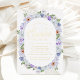 Elegant Easter brunch invitations featuring your brunch details in gold foil lettering surrounded by an oval frame of pastel violet purple and blue flowers with lush green leaves. The foil Easter brunch invitations reverse to display a solid light purple color background.