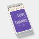 This wedding match design features a minimalist and contemporary aesthetic with a deep purple background that contrasts beautifully against the white text. The typography is bold and elegant, combining sans-serif for emphasis and cursive script to add a personal touch. Perfect for expressing love and gratitude, this design conveys warmth and celebration, making it ideal for weddings or special occasions. Customizable names and dates allow you to personalize these matches, creating a unique keepsake for your event.