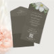 This design features a QR code rsvp online floral wedding invitation, with white floral magnolia template simple, on a budget trifold classic, an elegant all in one boho, watercolor earthy neutral tones colors, a classy modern minimal, with scan scannable guest response reply, a traditional calligraphy script formal, with an all in one greenery foliage, an elegant minimalist stationery suite