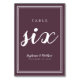 This design was created for smaller intimate wedding celebrations. Simple, minimalist and elegant Wedding Table Number SIX design features a contemporary design with a double frame border in crisp white on a CASSIS purple background. The design is chic and timeless. Personalize wedding table design with your wedding details in crisp white lettering and script. The back of the card is a duplicate of the front. Order one for every table with the individual table numbers.