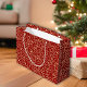 An elegant red and gold swirls and dots pattern on a gift bag, perfect for your Holiday gift giving needs.